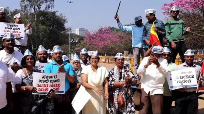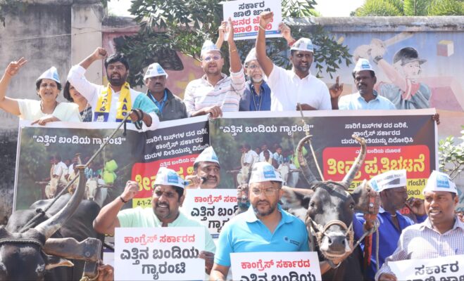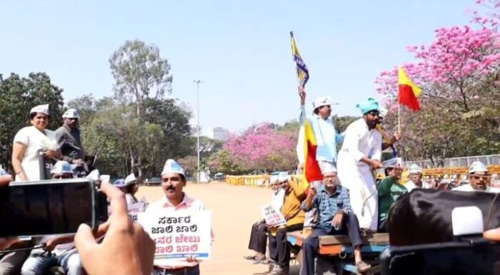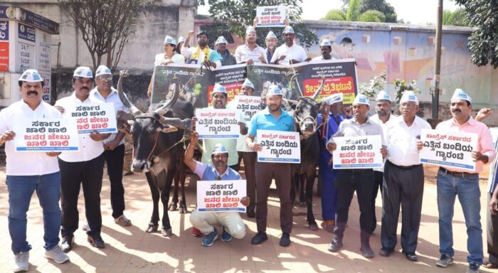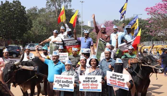 ಬೆಂಗಳೂರಿನ ಫ್ರೀಡಂ ಪಾರ್ಕಿನಲ್ಲಿ ಆಪ್ ನೂರಾರು ಕಾರ್ಯಕರ್ತರು ಎತ್ತಿನ ಬಂಡಿ ಎಳೆಯುವ ಮೂಲಕ ತೀವ್ರ ಪ್ರತಿಭಟನೆ ನಡೆಸಿದರು.