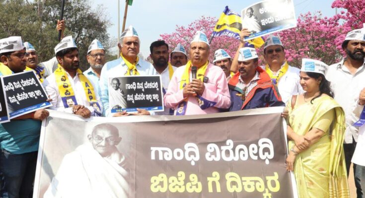 ನರೇಗಾ ಯೋಜನೆಗೆ ಪರ್ಯಾಯವಾಗಿ ರೂಪಿಸಿರುವ ವಿಕಸಿತ ಭಾರತ ಉದ್ಯೋಗ ಖಾತರಿ ಮತ್ತು ಜೀವನೋಪಾಯ ಮಿಷನ್ ಮಸೂದೆಯಲ್ಲಿ ರಾಷ್ಟ್ರಪಿತ ಮಹಾತ್ಮ ಗಾಂಧೀಜಿಯವರ ಹೆಸರನ್ನು ತೆಗೆದು ಹಾಕಿರುವ ಕೇಂದ್ರದ ಬಿಜೆಪಿ ಸರ್ಕಾರದ ವಿರುದ್ಧ ಬೆಂಗಳೂರಿನಲ್ಲಿ ಆಪ್ ಕಾರ್ಯಕರ್ತರು ಆಕ್ರೋಶ ವ್ಯಕ್ತಪಡಿಸಿದರು.