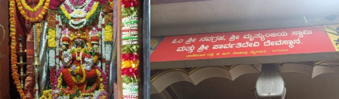 ಮೈಸೂರು: ಮೈಸೂರಿನ ಅಗ್ರಹಾರ ಕೆಆರ್ ಪೊಲೀಸ್ ಠಾಣೆಗೆ ಹೊಂದಿಕೊಂಡಿರುವ ಶ್ರೀ ಮೃತ್ಯುಂಜಯ ಸ್ವಾಮಿ ದೇವಾಲಯದಲ್ಲಿ ಶ್ರೀ ಪಾರ್ವತಿ ದೇವಿಗೆ ಕೊನೆಯ ಆಷಾಢ ಶುಕ್ರವಾರ ಪ್ರಯುಕ್ತ ಭವ್ಯ ಅಲಂಕಾರ ಮಾಡಲಾಗಿತ್ತು.