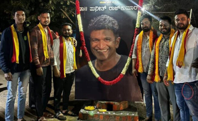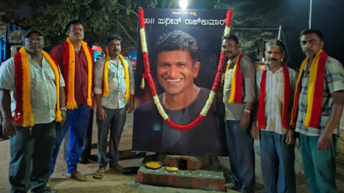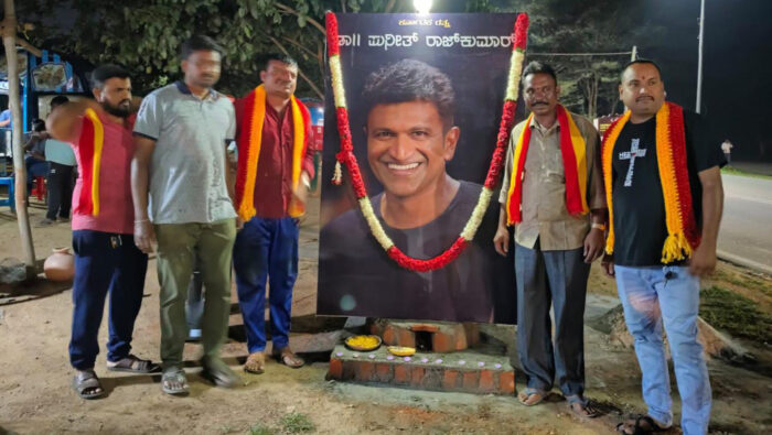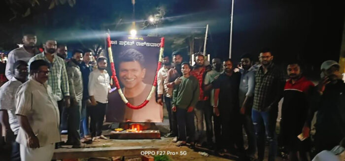 ಪುನೀತ್ ರಾಜಕುಮಾರ್ ಅವರ ದೊಡ್ಡ ಭಾವಚಿತ್ರ ಇಟ್ಟು ಪೂಜೆ ಮಾಡಿ ಪುಷ್ಪ ನಮನ ಸಲ್ಲಿಸಲಾಯಿತು.