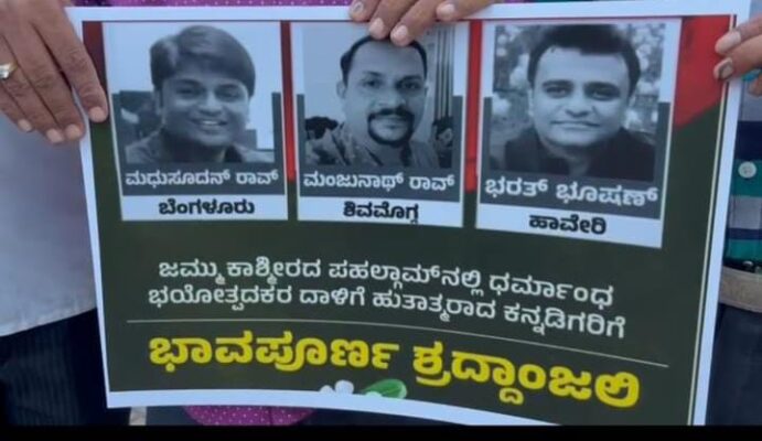 ದಾಳಿ ವೇಳೆ ಮೃತಪಟ್ಟ ಮೂವರು ಕನ್ನಡಿಗರ ಭಾವಚಿತ್ರಗಳನ್ನು ಹಿಡಿದು ಘೋಷಣೆಗಳನ್ನು ಕೂಗಿದರು.
