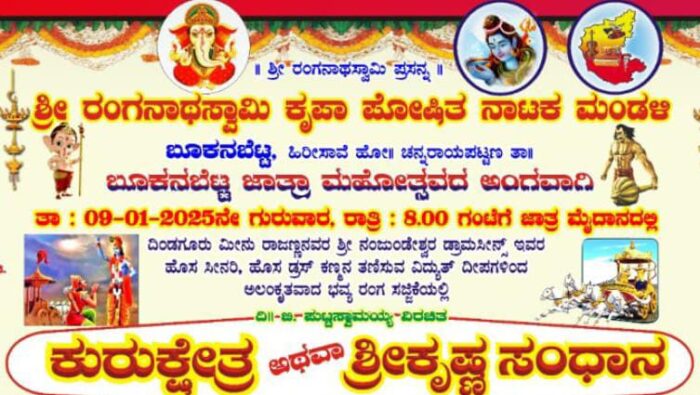 ಶ್ರೀರಂಗನಾಥ ಸ್ವಾಮಿ ಕೃಪಾಪೋಷಿತ ನಾಟಕ ಮಂಡಳಿ ವತಿಯಿಂದ ಬೂಕನ ಬೆಟ್ಟ ಜಾತ್ರಾ ಮಹೋತ್ಸವದ ಪ್ರಯುಕ್ತ ಜಾತ್ರಾ ಮೈದಾನದಲ್ಲಿ ಜನವರಿ 9ರಂದು ರಾತ್ರಿ 8 ಗಂಟೆಗೆ ಕುರುಕ್ಷೇತ್ರ ಅಥವಾ ಶ್ರೀ ಕೃಷ್ಣ ಸಂಧಾನ ನಾಟಕ ಏರ್ಪಡಿಸಲಾಗಿದೆ.