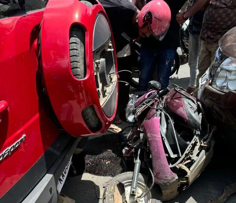 ಎರಡು ಕಾರುಗಳ ನಡುವೆ ಸಿಲುಕಿ ಸ್ಕೂಟರ್ ನಜ್ಜುಗುಜ್ಜು:ಸವಾರ ಗಂಭೀರ