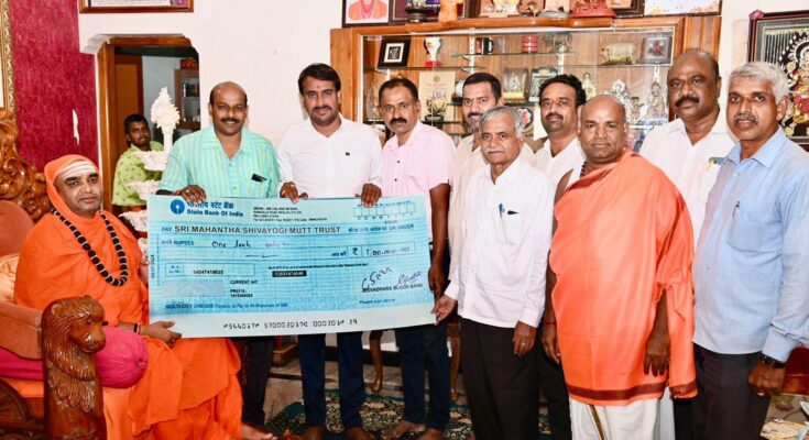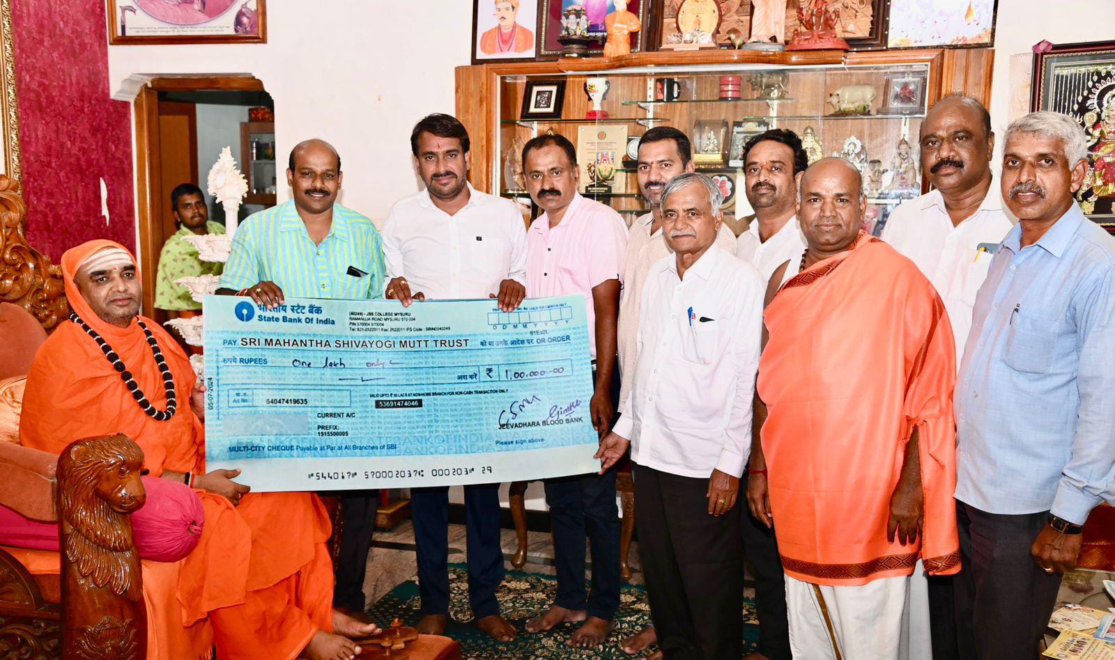 ಚೆಕ್ ಮುಖಾಂತರ ಆಶ್ರಮದ ಪೀಠಾಧ್ಯಕ್ಷರಾದ ಶ್ರೀ ತ್ರಿನೇತ್ರ ಮಹಾಂತ ಶಿವಯೋಗಿ ಸ್ವಾಮಿಗಳವರಿಗೆ ಒಂದು ಲಕ್ಷ ರೂ ದೇಣಿಗೆ ಹಸ್ತಾಂತರಿಸಲಾಯಿತು.