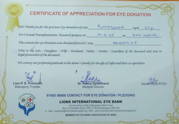 ಅವರು ತಮ್ಮ ಎರಡು ಕಣ್ಣುಗಳನ್ನು ದಾನ ಮಾಡಿ ಇಬ್ಬರ ಬಾಳಿಗೆ ಬೆಳಕಾಗುವ ಮಾದರಿಯಾಗಿ ಮರೆಯಾಗಿದ್ದಾರೆ.