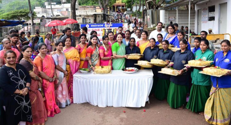 ಚಾಮುಂಡಿ ಬೆಟ್ಟದ ಪಾದದಲ್ಲಿ ಪೌರಕಾರ್ಮಿಕ ಮಹಿಳೆಯರಿಗೆ ಹಾಗೂ ತೃತೀಯಲಿಂಗಗಳಿಗೆ ಕರ್ನಾಟಕ ರಾಜ್ಯ ಮಹಿಳಾ ಆಯೋಗದ ಅಧ್ಯಕ್ಷರಾದ ಡಾ. ನಾಗಲಕ್ಷ್ಮಿ ಅವರು ಸೀರೆ, ಕುಂಕುಮ, ಅರಿಶಿಣ, ಬಳೆ ಸಹಿತ ಬಾಗಿನ ವಿತರಿಸಿ ಶುಭ ಕೋರಿದರು.