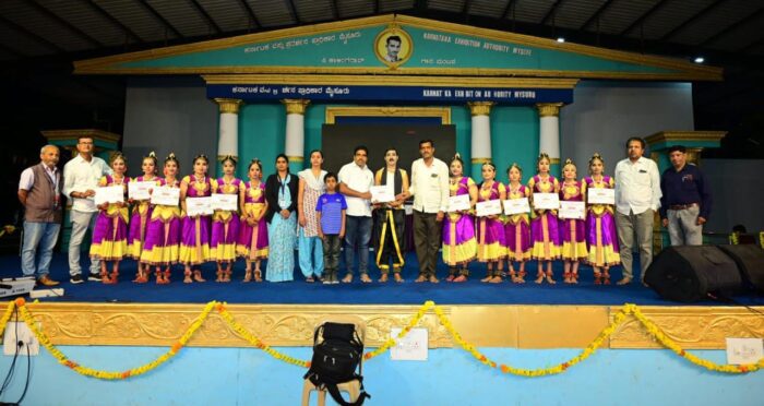 ಮೈಸೂರು: ಮೈಸೂರು ದಸರಾ ವಸ್ತುಪ್ರದರ್ಶನದ ಪಿ. ಕಾಳಿಂಗರಾವ್ ಗಾನಮಂಟಪದಲ್ಲಿ ಚಾಮರಾಜನಗರದ ಶ್ರೀ‌ ಶಾರದ ನೃತ್ಯಾಲಯದವರು ನಡೆಸಿಕೊಟ್ಟ ಭರತನಾಟ್ಯ ನೃತ್ಯವೈಭವ ಎಲ್ಲರ ಮನ ಸೂರೆಗೊಂಡಿತು.