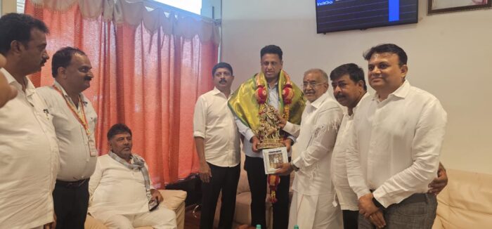 ಮೈಸೂರು: ಉಪಮುಖ್ಯಮಂತ್ರಿ ಡಿ. ಕೆ. ಶಿವಕುಮಾರ್ ಮತ್ತು ನಗರಾಭಿವೃದ್ಧಿ ಸಚಿವ ಸುರೇಶ್ ಹಾಗೂ ಉನ್ನತ ಶಿಕ್ಷಣ ಸಚಿವ ಡಾಕ್ಟರ್ ಎಂ ಸಿ ಸುಧಾಕರ್ ಅವರುಗಳನ್ನು ಮೈಸೂರು ಮಹಾನಗರ ಪಾಲಿಕೆ ಅಧಿಕಾರಿಗಳು ಮತ್ತು ಶಾಸಕ ಜಿ.ಟಿ.ದೇವೇಗೌಡ ಸನ್ಮಾನಿಸಿ ಶುಭ ಕೋರಿದರು.