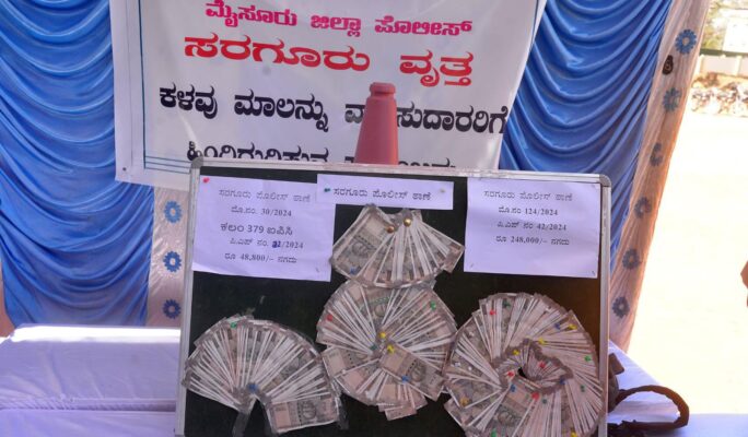 ಹಲವು ಪ್ರಕರಣಗಳಲ್ಲಿ ಮೈಸೂರು ಜಿಲ್ಲಾ ಪೊಲೀಸರು ವಶಪಡಿಸಿಕೊಂಡಿರುವ ಸ್ವತ್ತುಗಳನ್ನು ಹಿಂತಿರುಗಿಸುವ ಕಾರ್ಯಕ್ರಮವನ್ನು ಹಮ್ಮಿಕೊಳ್ಳಲಾಗಿತ್ತು.