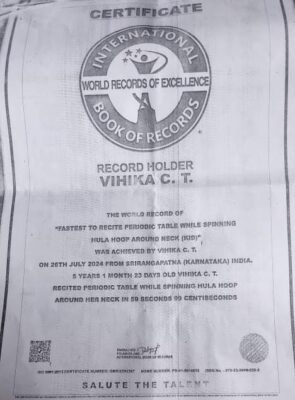 ವಿಹಿಕಾ ಎಸ್. ಟಿ. ಅವಳ ಕುತ್ತಿಗೆಯ ಸುತ್ತ ಹುಲಾ ಹೂಪ್ ಅನ್ನು ತಿರುಗಿಸುವಾಗ ಆವರ್ತಕ ಕೋಷ್ಟಕವನ್ನು ಪಠಿಸಿದ್ದು ವಿಶೇಷವಾಗಿತ್ತು. ಆಕೆ ಈ ಸಾಧನೆ ಮೂಲಕ ಇಂಟರ್ನ್ಯಾಷನಲ್ ಬುಕ್ ಆಫ್ ರೆಕಾರ್ಡ್ ಗೆ ಭಾಜನರಾಗಿದ್ದಾರೆ.