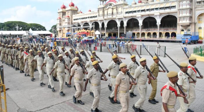 ಇಂದು ಬೆಳಗ್ಗೆ ಅರಮನೆ ಮುಂಭಾಗದಲ್ಲಿ ದಸರಾ ಜಂಬೂ ಸವಾರಿಯ ಪುಷ್ಪಾರ್ಚನೆಯ ತಾಲೀಮನ್ನು ಅರಣ್ಯ ಇಲಾಖೆ ಹಾಗೂ ಪೊಲೀಸ್ ಇಲಾಖೆ ಜಂಟಿಯಾಗಿ ನಡೆಸಿದವು.