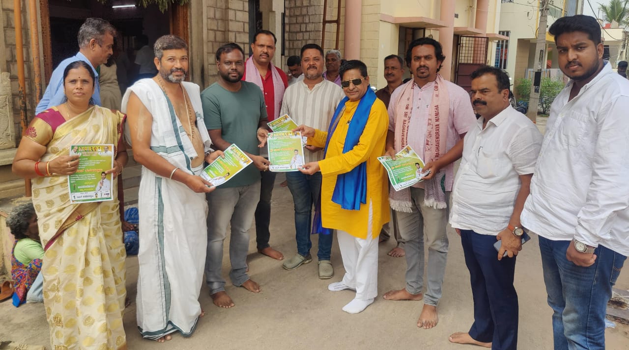 ಚನ್ನಪಟ್ಟಣದ ವರದರಾಜ ದೇವಸ್ಥಾನ ರಸ್ತೆಯಲ್ಲಿ ಶ್ರೀ ಗುರು ರಾಘವೇಂದ್ರ ಸ್ವಾಮಿ ದೇವಸ್ಥಾನದ ಮುಂಭಾಗ ನಿಖಿಲ್ ಪರ ಪ್ರಸನ್ನ ಕುಮಾರ್ ಅವರು ಕರಪತ್ರ ನೀಡಿ ಮತಯಾಚನೆ ಮಾಡಿದರು.