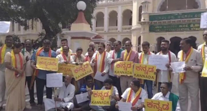 ಮೈಸೂರು: ಮೈಸೂರಿನಲ್ಲಿ ಎಲ್ಲಾ ಕಡೆ ಕಡ್ಡಾಯವಾಗಿ ಕನ್ನಡದಲ್ಲಿ ನಾಮಫಲಕ ಅಳವಡಿಸಬೇಕೆಂದು ಒತ್ತಾಯಿಸಿ ಮೈಸೂರು ಮಹಾನಗರ ಪಾಲಿಕೆ ಮುಂಭಾಗ ಕರ್ನಾಟಕ ಸೇನಾ ಪಡೆ ವತಿಯಿಂದ ಪ್ರತಿಭಟನೆ ನಡೆಸಲಾಯಿತು.