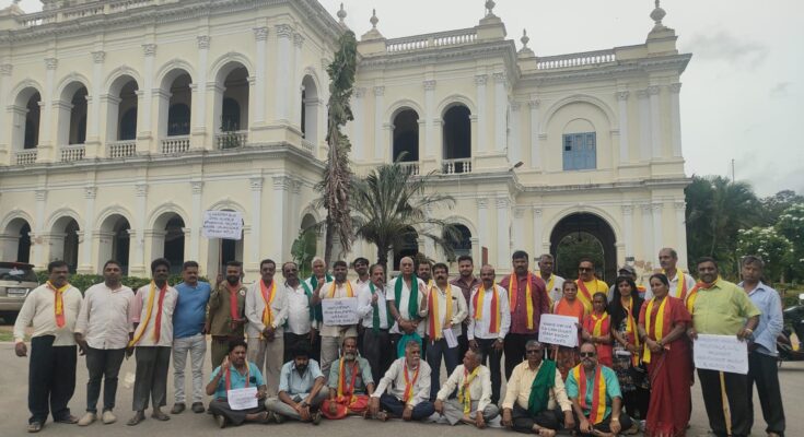 ಚಾಮುಂಡಿ ಬೆಟ್ಟದಲ್ಲಿ ಮೂಲಭೂತ ಸೌಕರ್ಯಗಳನ್ನು ನೀಡಲು ವಿಫಲವಾಗಿರುವ ಶ್ರೀ ಚಾಮುಂಡೇಶ್ವರಿ ಬೆಟ್ಟ ಪ್ರಾಧಿಕಾರ ಹಾಗೂ ರಾಜ್ಯ ಸರ್ಕಾರದ ನಡೆ ಖಂಡಿಸಿ ಇಂದು ಹಳೇ ಜಿಲ್ಲಾಧಿಕಾರಿಗಳ ಕಚೇರಿ ಮುಂಭಾಗ ಕರ್ನಾಟಕ ಸೇನಾ ಪಡೆ ಸದಸ್ಯರು ಪ್ರತಿಭಟನೆ ನಡೆಸಿದರು.