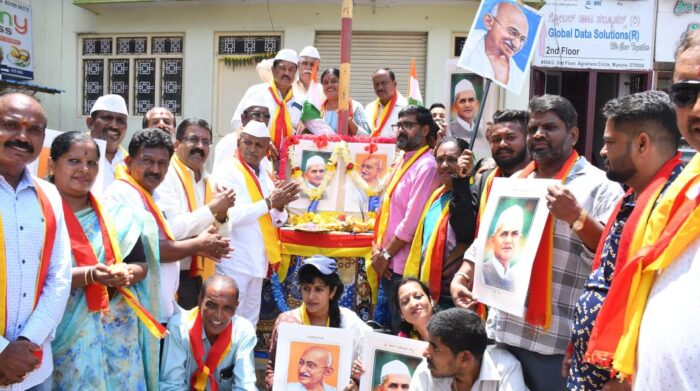 ಕರ್ನಾಟಕ ಸೇನಾ ಪಡೆ ವತಿಯಿಂದ ಮಂಗಳವಾರ ಮೈಸೂರಿನ ಅಗ್ರಹಾರ ವೃತ್ತದಲ್ಲಿ ನಮ್ಮ ದೇಶಕ್ಕೆ ಸ್ವಾತಂತ್ರ್ಯ ತಂದು ಕೊಡುವ ನಿಟ್ಟಿನಲ್ಲಿ ಮಹತ್ತರ ಪಾತ್ರ ವಹಿಸಿದ ರಾಷ್ಟ್ರಪಿತ ಮಹಾತ್ಮ ಗಾಂಧೀಜಿ ಹಾಗೂ ದೇಶ ಕಂಡ ಅತೀ ಸರಳ ಪ್ರಧಾನಿ ಲಾಲ್ ಬಹದ್ದೂರ್ ಶಾಸ್ತ್ರಿ ಅವರ ಜಯಂತಿ ಕಾರ್ಯಕ್ರಮದಲ್ಲಿ ಅವರು ಮಾತನಾಡಿದರು.