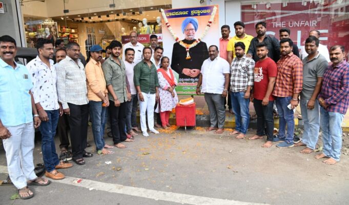 ನಗರದ ದೇವರಾಜ ಅರಸು ರಸ್ತೆಯಲ್ಲಿ ಮೈಸೂರು ಯುವ ಬಳಗದ ವತಿಯಿಂದ ಆಯೋಜಿಸಿದ್ದ ಮಾಜಿ ಪ್ರಧಾನ ಮಂತ್ರಿ ಮನಮೋಹನ್ ಸಿಂಗ್ ಅವರ ಸಂತಾಪ ಸಭೆಯಲ್ಲಿ ಭಾವಚಿತ್ರಕ್ಕೆ ಪುಷ್ಪ ನಮನ ಸಲ್ಲಿಸಿ ಹರೀಶ್ ಗೌಡ ಮಾತನಾಡಿದರು.