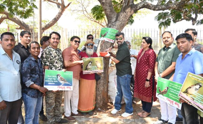 ವಿಶ್ವ ಗುಬ್ಬಚ್ಚಿ ದಿನಾಚರಣೆ ಅಂಗವಾಗಿ ಗುಬ್ಬಚ್ಚಿ ಹಬ್ಬ ಆಚರಣೆ ವೇಳೆ ಮರಗಳಲ್ಲಿ ಪಕ್ಷಿಗಳಿಗೆ ನೀರಿನ ಬೌಲು ಅಳವಡಿಸಿ ನೀರು ಹಾಗೂ ಆಹಾರ ಹಾಕುವ ಮೂಲಕ ಸ್ನೇಕ್ ಶ್ಯಾಮ್ ಚಾಲನೆ ನೀಡಿ ಮಾತನಾಡಿದರು.