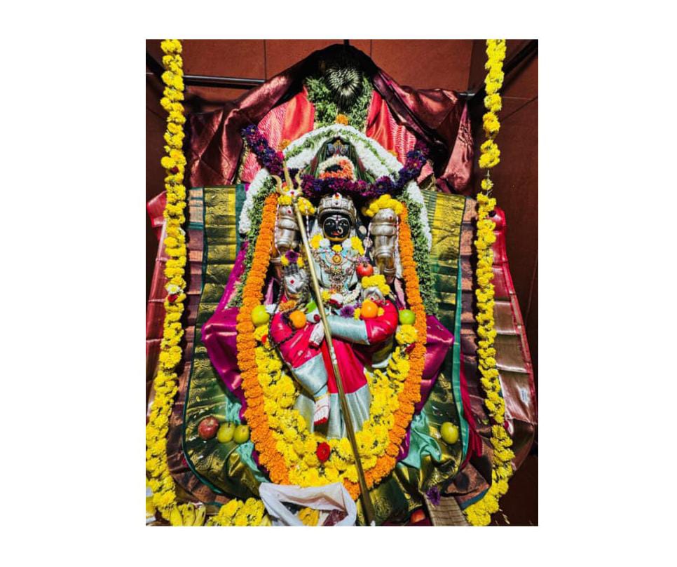 ಬೆಳ್ಳಿಯ ಕಿರೀಟ,ತ್ರಿಶೂಲ ಧಾರಿಯಾಗಿದ್ದಾಳೆ. ವಿವಿಧ ಬಗೆಯ ಹೂಗಳು,ಚಂಡು ಹೂವಿನ ಹಾರ,ಸೇವಂತಿಗೆ ಮಾಲೆ,ತುಳಸಿ ಮಾಲೆ ಧರಿಸಿ ಕೇಸರಿ ಬಣ್ಣದ ರೇಷ್ಮೆ ಸೀರೆ ಉಟ್ಟು ಸರ್ವಾಲಂಕಾರ ಭೂಶಿತಳಾಗಿ ಕಂಗೊಳಿಸುತ್ತಿದ್ದಾಳೆ ತಾಯಿ ಪಾರ್ವತಿ.ಅಷ್ಟುಚಂದದ ಅಲಂಕಾರ ಮಾಡಿದ್ದಾರೆ ಅಭಿನಂದನ್.