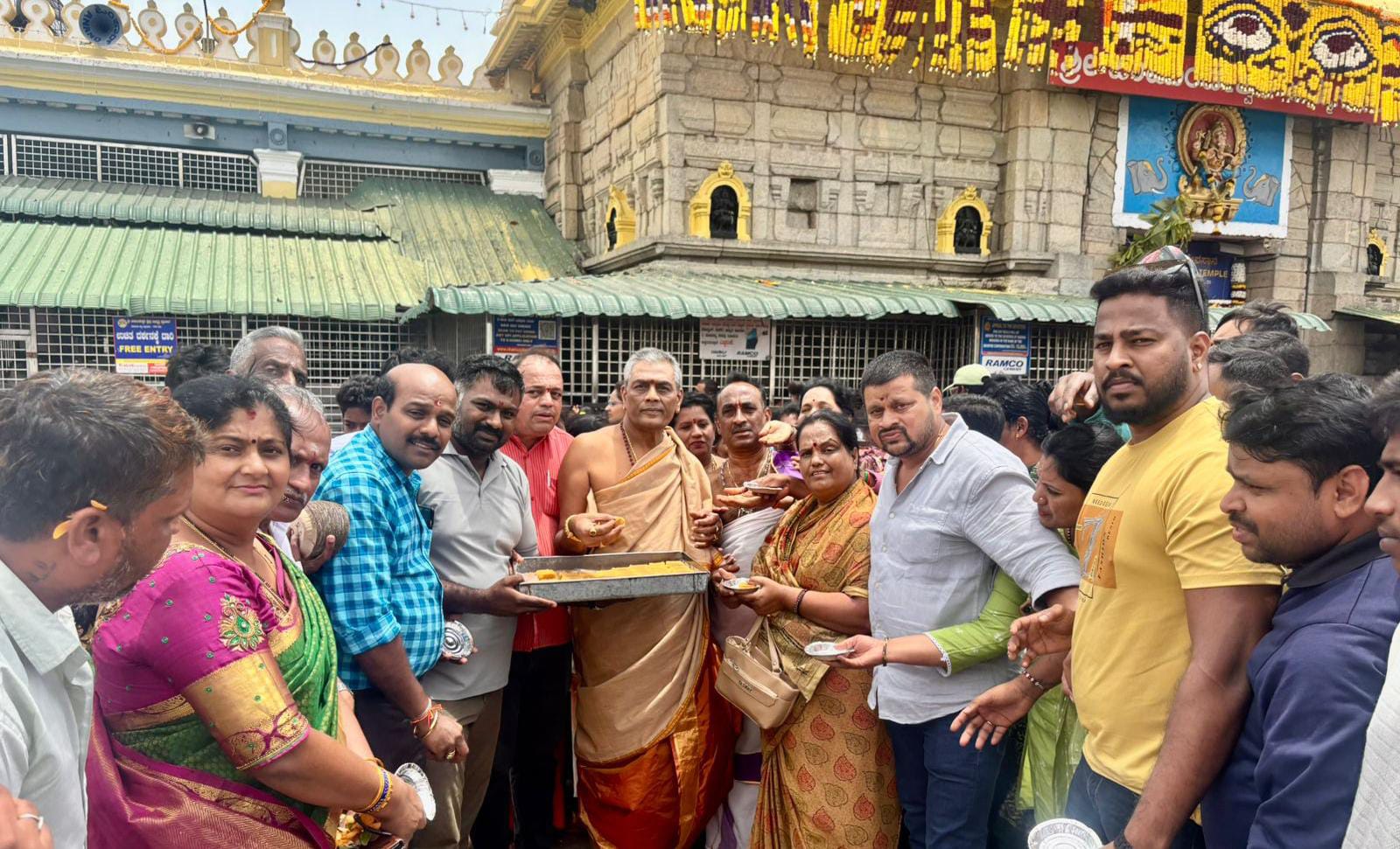 ಚಾಮುಂಡಿ ಬೆಟ್ಟದಲ್ಲಿರುವ ಚಾಮುಂಡೇಶ್ವರಿ ದೇವಸ್ಥಾನದ ಮುಂಭಾಗ ಭಕ್ತಾದಿಗಳಿಗೆ ಮೈಸೂರು ಪಾಕ್ ವಿತರಣೆ