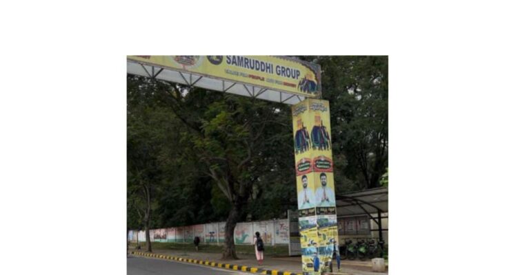 ಮೈಸೂರು: ಮೈಸೂರಿನ ರಾಮಸ್ವಾಮಿ ವೃತ್ತದಲ್ಲಿ ಅಳವಡಿಸಿರುವ ವಾಣಿಜ್ಯ ಜಾಹೀರಾತು ಕಮಾನು ಯಾವಾಗ ಪಾದಚಾರಿಗಳು ಮತ್ತು ವಾಹನ ಸವಾರರ ಜೀವಕ್ಕೆ ಅಪಾಯ ತರಲಿದೆಯೊ ಎಂದು ಸ್ಥಳೀಯರು ಆತಂಕ ವ್ಯಕ್ತಪಡಿಸಿದ್ದಾರೆ.
