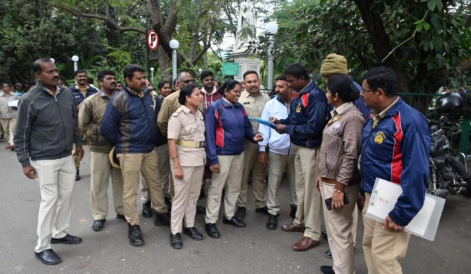 ಹೋಮ್ ಗಾರ್ಡ್ಸ್ ಅಧಿಕಾರಿಗಳು ಸಿಬ್ಬಂದಿಗೆ ಎಲ್ಲೆಲ್ಲಿ ಹೇಗೆ ನಿಗಾ ವಹಿಸಬೇಕೆಂದು ರಸ್ತೆಯಲ್ಲೇ ಸಲಹೆ, ಸೂಚನೆಗಳನ್ನು ನೀಡಿದರು.
