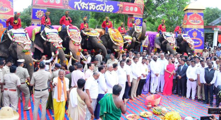 ಮೈಸೂರು: ವಿಶ್ವವಿಖ್ಯಾತ ನಾಡಹಬ್ಬ ದಸರಾ ಗಜಪಯಣ ಸ್ವಾಗತ ಕಾರ್ಯಕ್ರಮಕ್ಕೆ ಸೋಮವಾರ ನಾಗರಹೊಳೆ ರಾಷ್ಟ್ರೀಯ ಉದ್ಯಾನವನ, ವೀರನಹೊಸಳ್ಳಿ ಬಳಿ ಸಾಂಪ್ರದಾಯಿಕವಾಗಿ ಪೂಜೆ ಸಲ್ಲಿಸುವ ಮೂಲಕ ಚಾಲನೆ ನೀಡಲಾಯಿತು.