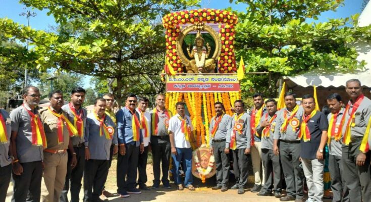 ರಾಜ್ಯೋತ್ಸವ ಪ್ರಯುಕ್ತ ನಾಡದೇವಿ ಶ್ರೀ ಭುವನೇಶ್ವರಿ ದೇವಿಯ ಸ್ತಬ್ದ ಚಿತ್ರ ಮೆರವಣಿಗೆ ಮಾಡಿ ಪೂಜೆ ಸಲ್ಲಿಸಲಾಯಿತು.
