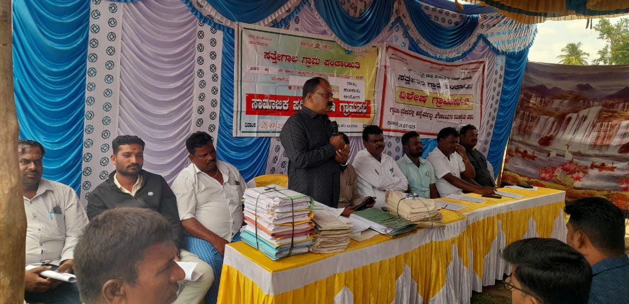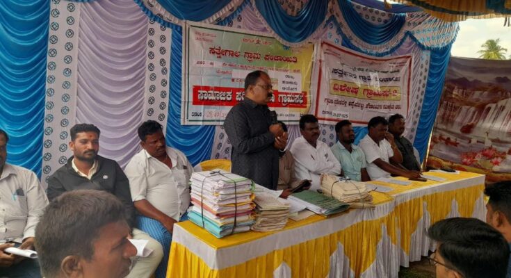 ಗ್ರಾಮ ಪಂಚಾಯಿತಿ ಮುಂಭಾಗದಲ್ಲಿ ಅಧ್ಯಕ್ಷ ಮಲ್ಲೇಶ್ ಅವರ ಅಧ್ಯಕ್ಷತೆಯಲ್ಲಿ ನಡೆದ ಸಭೆಯಲ್ಲಿ ನರೇಗಾ ಯೋಜನೆಯ ಅನುದಾನದಲ್ಲಿ ಏ.1, 2024 ರಿಂದ ಮಾ.31, 2025 ರ ವರೆಗೆ ನಡೆಸಲಾಗಿರುವ ಕಾಮಗಾರಿಗಳು ಹಾಗೂ 15 ನೇ ಹಣಕಾಸು ಯೋಜನೆ, ರಾಜ್ಯ ಹಣಕಾಸು ಆಯೋಗದ ಅನುದಾನದಲ್ಲಿ 2020 – 2021 ನೇ ಸಾಲಿನಿಂದ 2024-2025 ನೇ ಸಾಲಿನ ವರೆಗೆ ನಡೆಸಲಾಗಿರುವ ಕಾಮಗಾರಿಗಳ ವಿವರವನ್ನು ನರೇಗಾ ಲೆಕ್ಕಪರಿಶೋಧನಾ ಸಂಯೋಜಕ  ಸಿದ್ದಪ್ಪಾಜಿ ಅವರು ಸಾರ್ವಜನಿಕರ ಸಮ್ಮುಖದಲ್ಲಿ ಸಭೆಗೆ ಮಂಡಿಸಿದರು.