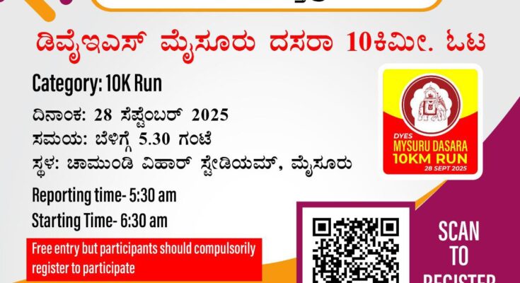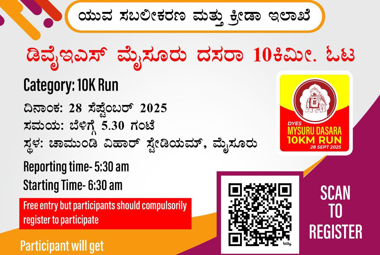 ಸೆಪ್ಟೆಂಬರ್ 28 ರಂದು ಬೆಳಿಗ್ಗೆ ‌5.30 ಕ್ಕೆ ಮೈಸೂರಿನ ಚಾಮುಂಡಿ ವಿಹಾರ ಸ್ಟೇಡಿಯಂ ನಲ್ಲಿ 10 ಕಿ.ಮೀ ಓಟ ಇದ್ದು,15 ವರ್ಷದಿಂದ 45 ವರ್ಷದವರು ಪಾಲ್ಗೊಳ್ಳಬಹುದು.