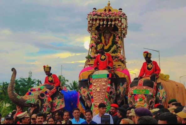 ನಾಡ ಅಧಿದೇವತೆ ಚಾಮುಂಡೇಶ್ವರಿ ಅಮ್ಮನವರು ಸರ್ವಾಲಾಲಂಕೃತಗೊಂಡ ಮಹೇಂದ್ರ ಆನೆಯ ಮೇಲೆ ಸಿಂಹಾಸನದೀಶ್ವರಿಯಾಗಿ ಗಜ ಗಾಂಭೀರ್ಯದಿಂದ ರಾಜಮಾರ್ಗದಲ್ಲಿ ಹೆಜ್ಜೆ ಹಾಕಿದಾಗ ಜಾನಪದ ಕಲಾ ತಂಡಗಳು,