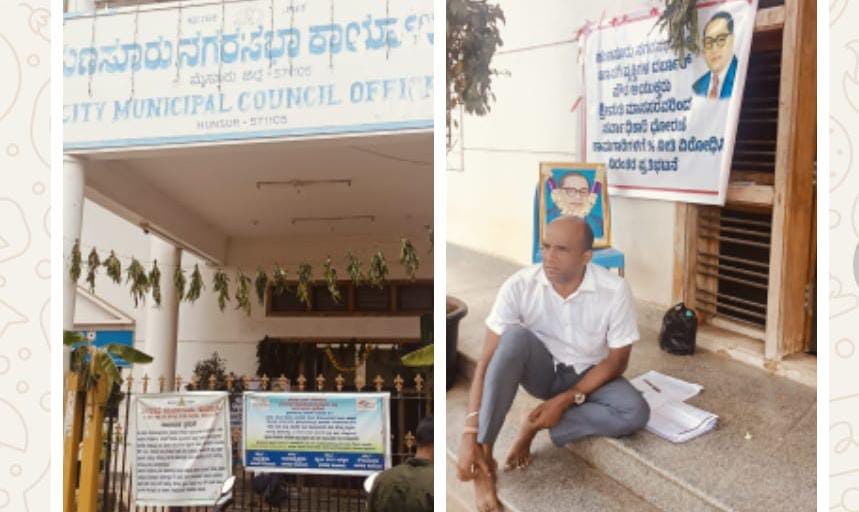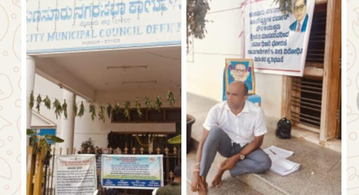 ಹುಣಸೂರು ನಗರಸಭೆಯಲ್ಲಿ ಖಾಸಗಿ ವ್ಯಕ್ತಿಗಳ ದರ್ಬಾರ್, ಪೌರ ಆಯುಕ್ತರು ಶ್ರೀಮತಿ ಮಾನಸ ಅವರಿಂದ ಸರ್ವಾಧಿಕಾರಿ ಧೋರಣೆ, ಅಧಿಕಾರಿಗಳಿಗೆ % ನೀತಿ ವಿರೋಧಿಸಿ ನಿರಂತರ ಪ್ರತಿಭಟನೆ ಎಂದು ವಿವೇಕಾನಂದ ಅವರು ಪೋಸ್ಟರ್ ಕೂಡ ಹಾಕಿದ್ದರು.