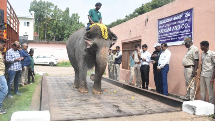 ಅ. 12ರಂದು ನಡೆಯಲಿರುವ ವಿಜಯ ದಶಮಿ ಹಿನ್ನೆಲೆಯಲ್ಲಿ ಆನೆಗಳಿಗೆ ಮತ್ತೊಮ್ಮೆ ತೂಕ ಮಾಡಲಾಯಿತು.